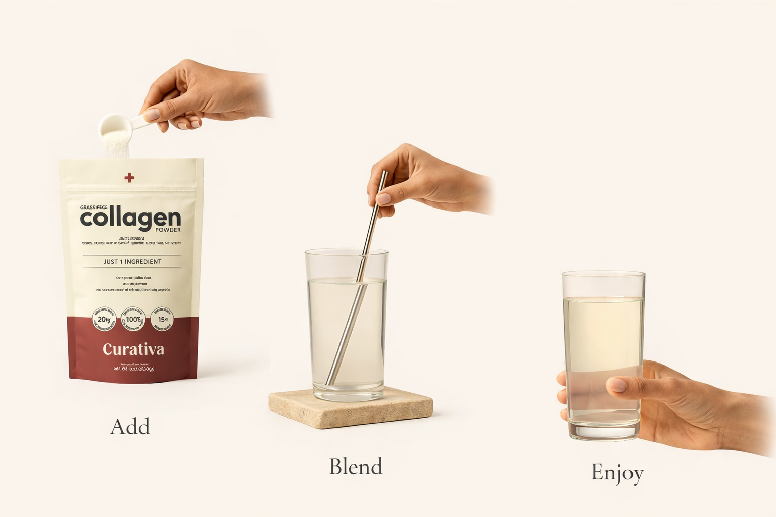 Scoop, stir for a few seconds and watch it disappear—no fizz, no flavour, just pure peptides your body can use.